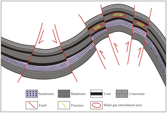 Taking the Lower Permian Shanxi and Pennsylvanian Taiyuan Formations in the northeastern Ordos Basin, and the Upper Permian Longtan Formation in southwestern Guizhou as examples, Upper Paleozoic transitional shale gas enrichment factors were analysed. Lithological associations, sedimentary facies, gas generation threshold, pore space, and structural characteristics are the main controlling factors of Upper Paleozoic transitional shale gas enrichment. As discussed in Section 4.1., Section 4.2., Section 4.3., carbonaceous mudstone adjacent to coal seams, which is primarily developed in swamps in the delta plain environment, and lagoons and swamps in the barrier coastal environment, presents a high gas content level. The gas generation threshold maturity (Rmax) is 1.6%, and pore space has the tendency to increase when Rmax ranges between 1.6% and 3.0%, so shale gas is mainly distributed in the areas with a maturity range of 1.6%–3.0%. Upper Paleozoic strata of the northeastern Ordos Basin and southwestern Guizhou present different structural characteristics. The Ordos Basin is a stable multicycle cratonic basin which is not heavily folded or deformed, and Paleozoic-Mesozoic strata in the main section dip to the west at less than 1° [12,13], which leads to the continuous distribution of shale gas enrichment areas along the slope (Figure 10). Long-term tectonic movements lead to the development of folds, faults, and fractures, forming a complex structural morphology [15,16,17]. Fractures enrich the reservoir space, favoring shale gas storage and reservoir reconstruction, and sealing faults can prevent shale gas migration to adjacent formation. Therefore, shale gas can be enriched in the areas with abundant fractures and favorable sealing faults in southwestern Guizhou (Figure 11).