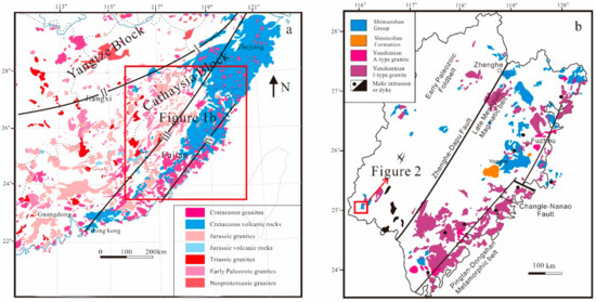 - Li, P.J.; Yu, X.Q.; Li, H.Y.; Qiu, J.T.; Zhou, X. Jurassic–Cretaceous tectonic evolution of Southeast China: Geochronological and geochemical constraints of Yanshanian granitoids. Int. Geol. Rev. 2013, 55, 1202–1219. [Google Scholar] [CrossRef]