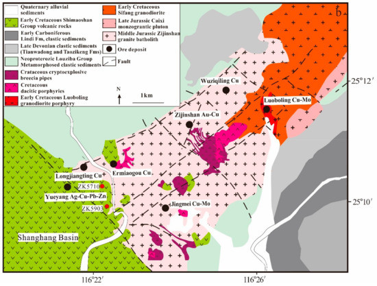 Geological map of the Zijinshan Cu–Au ore district showing a cluster of porphyry Cu–Mo and porphyry-epithermal Au–Cu deposits, modified from [12,19].
