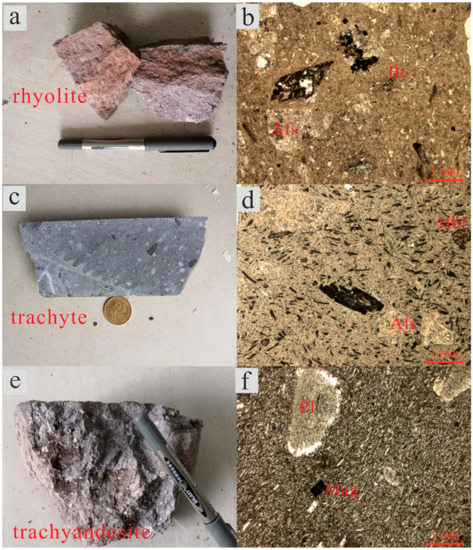 Photographs of rock hand specimens (a,c,e) and photomicrographs (b,d,f) of Shimaoshan Group volcanic rocks. Abbreviations: Hbl = Hornblende; Pl = plagioclase; Afs = Alkaline feldspar; Mag = magnetite, Bt = biotite.