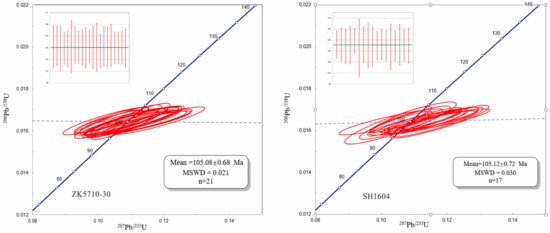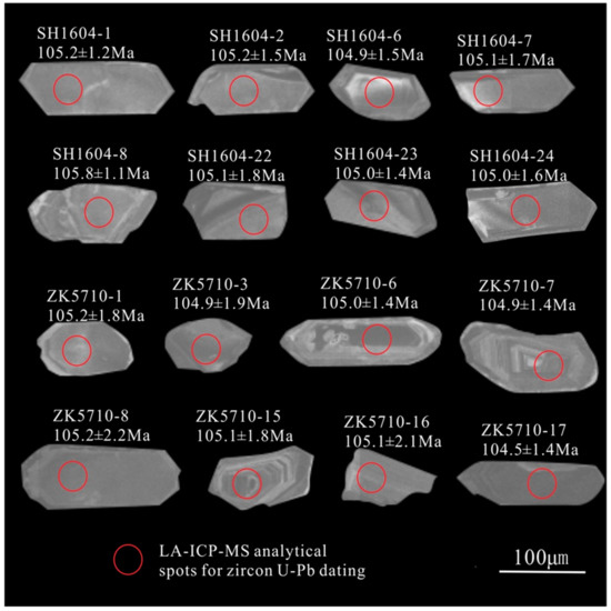 The U–Pb isotope data are listed in Supplementary Table S1, and representative zircon CL images and U–Pb concordia diagrams are shown in Figure 4 and Figure 5, respectively. Zircon crystals from trachyte sample SH1604 are generally euhedral, transparent, and light gray in color, with lengths varying from 100 to 300 μm and aspect ratios from 1:1 to 3:1. The zircon grains have Th and U contents of 205–2127 ppm and 458–1246 ppm, respectively, with Th/U values of ~0.36–1.70 (mostly >0.4), indicating a magmatic origin for these zircons. A total of 18 analyses on 18 zircons from sample SH1604 were obtained after discarding eight ages owing to their high level of discordance, yielding a concordant 206Pb/238U age of 105.04 ± 0.83 Ma (MSWD = 0.03; 1σ), with a weighted mean 206Pb/238U age of 105.12 ± 0.72 Ma (MSWD = 0.03; 1σ). This mean age can be considered as the crystallization age of the trachyte sample. Analysis spots SH1604-10 and SH1604-11 yielded older 206Pb/238U ages of 127.6 and 129.1 Ma, respectively, which we interpret as representing zircons captured from country rock during magma ascent. The features of zircon crystals from trachyte sample ZK5710-30 are similar to those of SH1604 with varying contents of Th and U (150–480 ppm and 421–1655 ppm, respectively) and Th/U values of ~0.29–0.68 (mostly >0.4). A total of 21 analyses on 21 zircons from sample ZK5710-30 were obtained after discarding four ages on account of their high level of discordance, yielding a concordant 206Pb/238U age of 105.08 ± 0.70 Ma (MSWD = 0.02; 1σ), with a weighted mean 206Pb/238U age of 105.08 ± 0.68 Ma (MSWD = 0.02; 1σ). This mean age can be interpreted as the crystallization age of the trachyte sample.