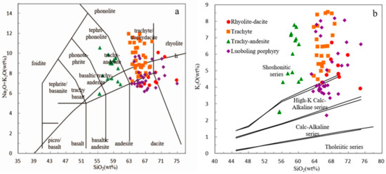 (a) Classification of volcanic rocks from the Shanghang Basin by plotting total alkali versus silica (TAS) diagram and (b) The whole rock K2O versus SiO2 diagram. Data for the Luoboling porphyry are from [32,35,51].