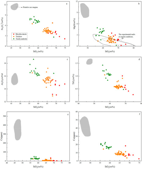 Diagrams of various major oxides and trace elements versus SiO2 for volcanic rocks from the Shanghang Basin. (a) Fe2O3T; (b) MgO; (c) Al2O3; (d) TiO2; (e) Cr; (f) Co. The gray shaded area represents primitive arc melt [52]. The dotted line represents the field of experimental crust melts, data from [36]. the solid line represents the field of metabasaltic and eclogite experimental melts at 1–4 GPa, data from [53].