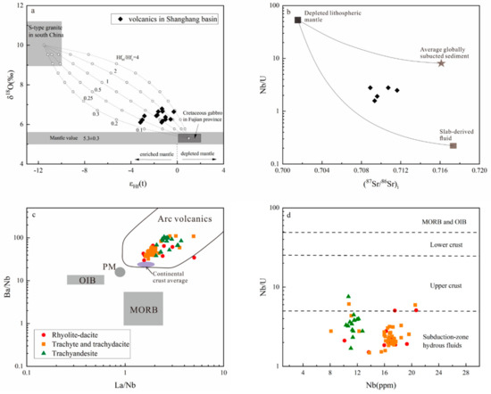 Element and isotope variation diagrams for volcanic rocks from the Shanghang Basin. (a) Zircon δ18O versus εHf(t). The S-type granite compositions are εHf(t) = –12 and δ18O = 10‰. The Fujian Cretaceous gabbro compositions are εHf(t) = 1 and δ18O = 5.3‰. Data for S-type granite in South China and Fujian Cretaceous gabbro are from [55,59,60],; (b) The whole rock Nb/U versus (87Sr/86Sr)i. Data for globally subducted sediment and slab-derived fluid are from [61,62]; (c) The whole rock Ba/Nb versus La/Nb. Data for arc volcanic rocks, average continental crust, OIB, PM, and MORB are from [63]; (d) The whole rock Nb/U versus Nb. The regions between the dashed lines are from [64,65,66].