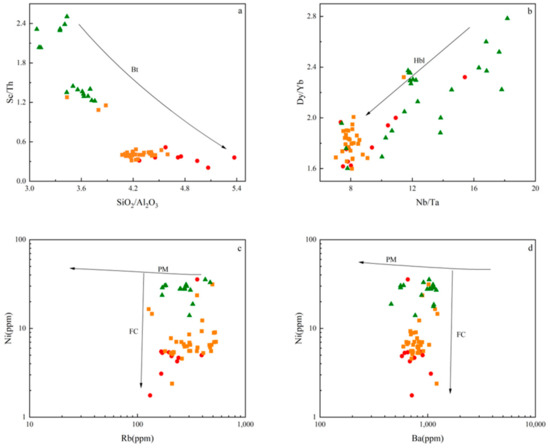 The SiO2 content of the studied samples is negatively correlated with various elements, including Fe2O3T, MgO, Al2O3, and TiO2 (Figure 7). These negative correlations can be interpreted in terms of fractionation of mafic minerals, such as magnetite, hornblende, and biotite, which tend to remove most of the Fe, Mg, and Ca from melts and cause them to evolve toward more silicic compositions [4]. Owing to different partition coefficients of the various elements, a correlation diagram of the element ratios can qualitatively determine separation of mineral phases. For example, fractionation of biotite can lead to an increase in SiO2/Al2O3 and a decrease in Sc/Th (Figure 11a), and fractionation of hornblende can result in a positive correlation between Dy/Yb and Nb/Ta (Figure 11b). These patterns suggest that the magma underwent fractional crystallization of amphibole and biotite when it evolved from an andesitic to a dacitic composition. The observed decreases in V and Ti with SiO2 may be related to the separation of Fe–Ti oxides, such as magnetite, as supported by microscope observations (Figure 3f). Moreover, fractional crystallization and partial melting trends can be distinguished in diagrams of Ni versus Rb and Ni versus Ba (Figure 11c,d).