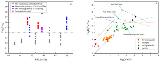 (a) Zircon EuN/EuN* versus whole rock SiO2 for volcanic rocks from the Shanghang Basin and other porphyry deposits (data for other deposits are from [4,35,51,89]). (b) Whole rock Fe2O3T versus MgO for volcanic rocks from the Shanghang Basin and other arc magmas, data for the latter are from [99,100,101,102].