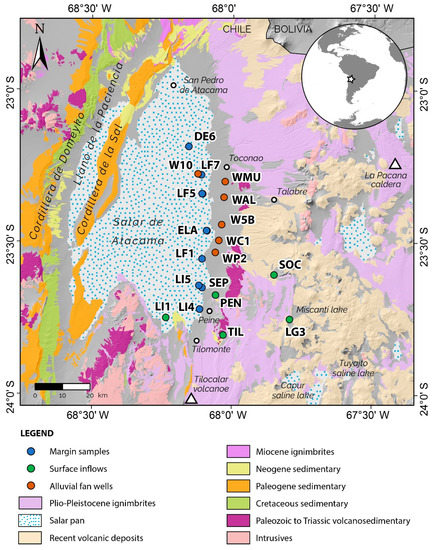 Figure 1. Map of the Salar de Atacama basin from References [36,37,38], showing the major rock units and the sample locations.