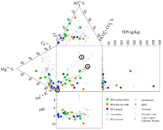 Figure 2. Durov figure including data from the Salar de Atacama (this study),the Loa groundwater basin [13], the Monturaqui-Negrillar-Tilopozo aquifer [35], neighboring basins Capur, Tuyaito and Aguas Calientes 3 [11], plus important regional thermal water [40,41].