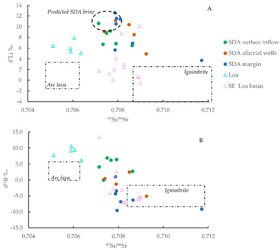 Figure 3. Diagrams showing the relationship between lithology, as indicated by 87Sr/86Sr and (A) Li and (B) isotopes. Ignimbrite and arc lava fields are from References [7,13,47,48]. Data for water in the neighboring upper Loa drainage basin is from [13], virtually the same. Ignimbrite and arc lava fields are from References [7,13,47,48].