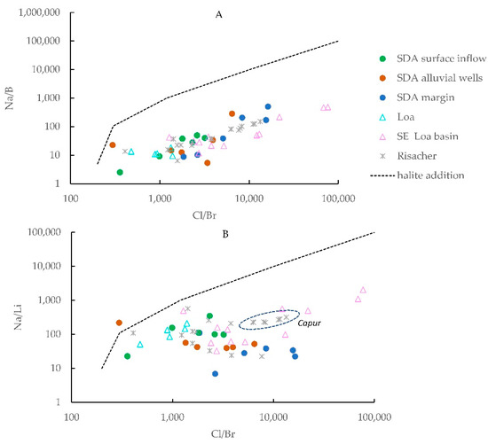 High Cl/Br ratios as well as high Cl and Na concentrations are often used to demonstrate the presence of dissolved halite [54]. High Cl/Br ratios and low δ11B were used to demonstrate the role for evaporite mineral dissolution in influencing the geochemistry of water draining ignimbrite covered areas of the neighboring upper Loa basin [13]. In order to evaluate the halite dissolution, we studied Na/B and Na/Li ratios compared to Cl/Br (Figure 4); B and Li concentrations are normalized to Na to address possible changes due to evaporative enrichment. In terms of B, corresponding increases in Na/B and Cl/Br (Figure 4A) are consistent with halite dissolution. In comparison to the upper Loa basin, Na/Li ratios do not change or slightly decrease (Figure 4B) as Cl/Br increases. Moreover, two samples near Toconao (HON and LF7) have remarkably low Na/Li. If increasing Cl/Br ratios indicate halite is a source of Cl, and hence Na, either Li and halite come from the source area but Li does not itself originate from halite, or the halite itself is extremely enriched in Li, possibly due to Li-rich inclusions since Li does not fit into the halite lattice. The sodium-normalized distribution coefficients of Li in halite are around 0.05 to 0.005 [5], so if Cl/Br and Li only increase due to dissolving halite, the brine from which that halite precipitated must have had a very high Li concentration.