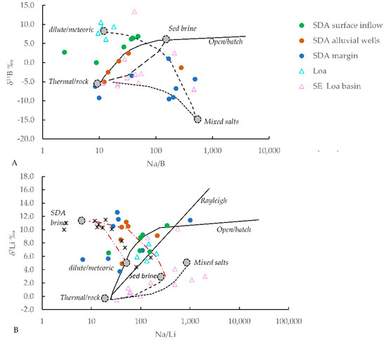 Models describing mixing, open system and Rayleigh fractionation, used to describe stable isotopes in rivers draining volcanic systems, including water in the upper Loa basin [13], are applied here. The same equations are used to address Li and B; the example given is for Li [55]. Open system fractionation follows δ7Liw = δ7Lii − (1 − f). Δ7Lic-w and Rayleigh fractionation δ7Liw = δ7Lii – Δ7Lic-w.ln(f), where δ7Liw is the isotope composition of the evolving water, δ7Lii its initial isotope composition, Δc-w the isotope separation between clay and f the fraction of Li remaining in solution. Li was normalized to Na, and Na was assumed to be conservative.