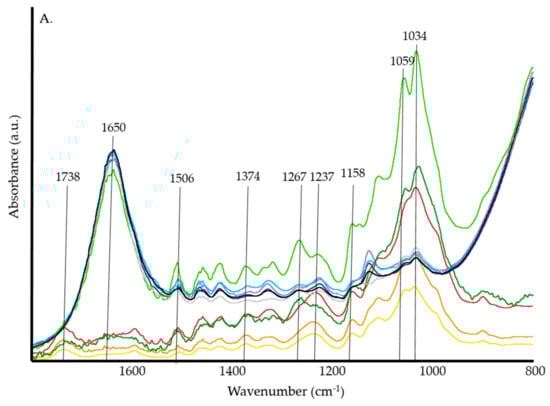 Spectra recorded on untreated samples were considered as a starting point (t0) for the characterization campaign. Before extraction, differences could be observed between the spectra from fresh and archaeological wood sets (Figure 2A). Vibrational bands at 1034 and 1059 cm−1 were very intense for fresh wood and decreased in intensity for archaeological wood sets. Only set F (Figure 2A, light green line) which is lake pinewood presented a mean spectrum similar to fresh samples. These bands were assigned to C–O stretching of holocellulose and lignin []. Moreover, the intensity of vibrational band at 1738 cm−1 assigned to C=O stretching in xylan, a component of hemicellulose [], decreased for archaeological wood sets. All these observations suggested a degradation of holocellulose content within the archaeological wood sets. On the contrary, archaeological samples displayed intense band at 1650 cm−1 attributed to H2O deformation due to the water absorbed by waterlogged wood during burial time (Figure 2A). The vibrational bands at 1237 and 1267 cm−1 were assigned to C–O stretching (lignin and xylan) and to C–H and O–H wagging (cellulose and xylan) [,,]. Generally, a higher intensity of these bands was observed for fresh wood presenting differences between the wood species.