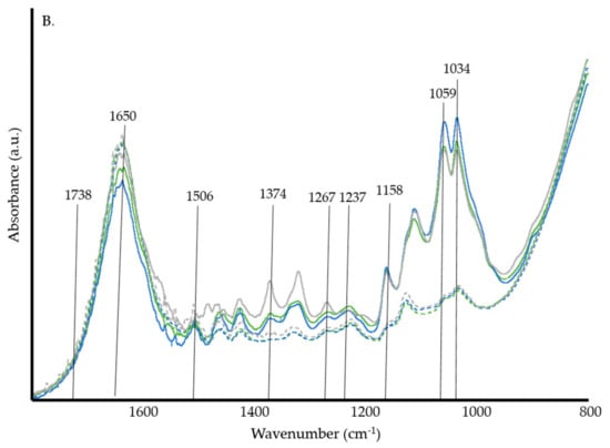 After extraction, BT and CT extraction methods presented similar spectra while NT samples showed different bands intensities. The bands at 1034 and 1059 cm−1 were still observed for fresh samples (Figure 2B, full lines). However, the intensities of bands in the range 1300–1200 cm−1 decreased. All sets presented adsorbed water with a characteristic band at 1650 cm−1. Archeological samples still had bands less intense in the range 1400–1200 cm−1 suggesting that the degradation of fresh wood was not comparable to in situ degradation (Figure 2B, dashed lines). Finally, none of the sets displayed the band at 1738 cm−1, meaning that xylan content was probably degraded for all wood samples (Figure 2B).