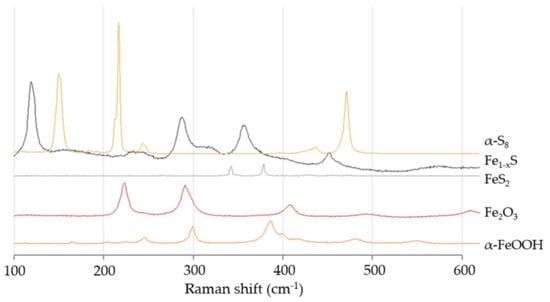First, the reference compounds were analyzed. Raman spectra obtained are displayed in Figure 3. Spectra obtained from goethite, hematite, sulfur and pyrite were similar to that described in the literature [,]. For the synthetized mackinawite, the bands obtained at 119(s), 235(w), 282(s), 320(w), 360(s) and 452(m) cm−1 suggest the formation of an intermediary phase, partially oxidized mackinawite Fe1−xS [].