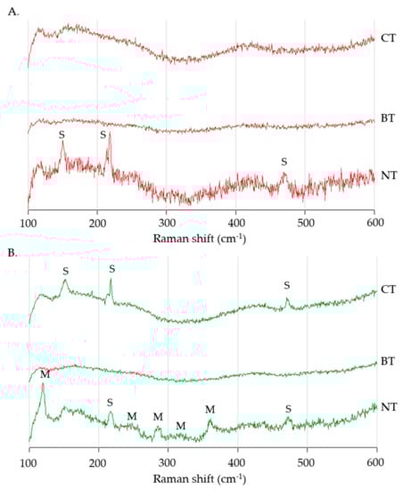 Raman spectra obtained on A. set B (fresh oak) and B. set E (fresh pine) untreated (NT), biologically treated (BT) and chemically treated (CT); with sulfur (S) and partially oxidized mackinawite (M) characteristics shifts indicated.