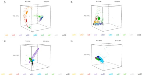 After extraction, all sets gathered, independently of the extraction method applied (Figure 6B). Some clusters can be observed. Sets E and F (artificially contaminated pinewood) overlapped, A1 and A2 sets (balsa) also overlapped as for sets C, D1, D2 and G2 (archaeological oak wood). Only exception is set G1, overlapping with archaeological oak sets though G1 is archaeologic pinewood. It seemed that when a certain state of degradation is reached, the wood species does not influence the classification. These clusters are related to wood composition, which is identical within each cluster.