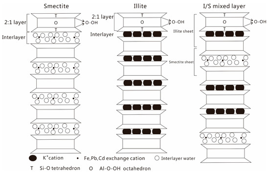 Illite, smectite, or I/S mixed layer minerals are all 2:1 phyllosilicates that are widespread in soils. The crystal structure of illite and smectite can be described as one octahedral sheet “sandwiched” between two opposite tetrahedral sheets with an extra interlayer (Figure 1). The significant difference between illite and smectite is the adsorption ability of the interlayers. The interlayers of illite are mainly filled by K+, while the interlayers of smectite are filled by many kinds of metal cations or even water molecules. Therefore, the adsorption capacity of smectite is much greater than illite. The I/S mixed layer represents a transitional mineral between illite and smectite composed of illite and smectite crystalline layers along the C axis (plane normal) or perpendicular to the (001) direction (Figure 1). Therefore, the adsorption ability of illite–smectite mixed layers consisting of 2:1 layers, K+-filled interlayers, and other interlayers filled with cations should be between illite and smectite.