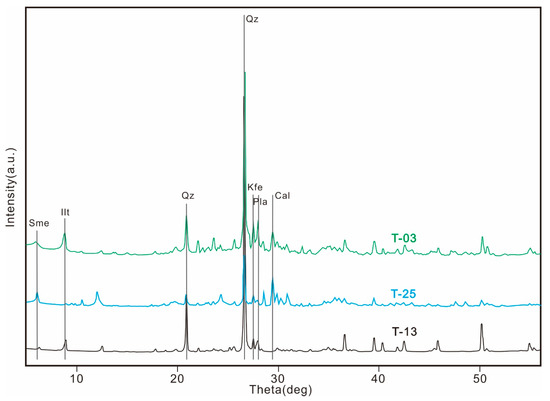 Figure 2. XRD spectra of three selected samples. Sme: smectite, Ilt: illite, Qz: quartz, Kfe: K-feldspar, Pla: plagioclase, and Cal: calcite.