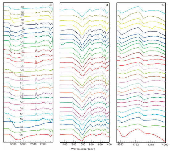 The Si–O fundamental absorption bands were located at nearly 1000 cm−1 in the MIR spectra of this study, and the Si–O vibrational behavior did not form NIR spectra [25,26]. These bands were therefore not compared to NIR data in this research. The MIR spectra in two regions of the 28 samples are shown in Figure 3a,b.