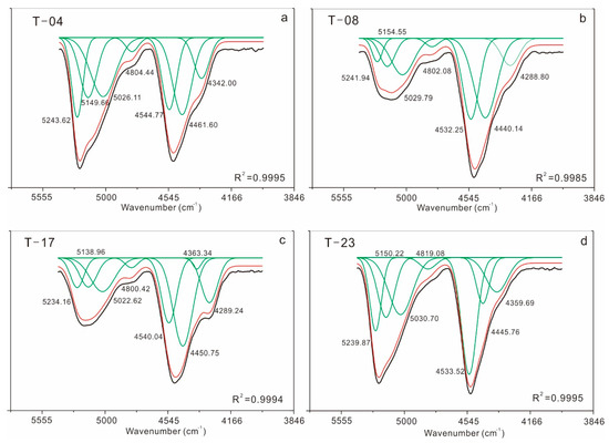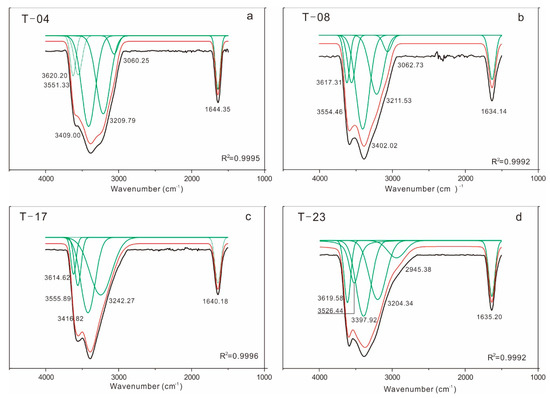 Figure 4. Decomposition of the MIR bands in the high-frequency area of four samples (a) T-04, (b) T-08, (c) T-17, and (d) T-23. Black lines: experimental spectra; green lines: individual bands; red lines: fitted curves.