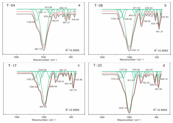 Figure 5. Decomposition of the MIR bands in the low-frequency area of four samples (a) T-04, (b) T-08, (c) T-17, and (d) T-23. Black line: experimental; green line: fit and diagnostic bands.