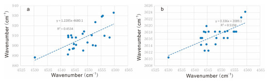 Figure 7. Linear correlation between NIR absorption bands and MIR ((a) shows MIR bands near 907 cm−1, (b) shows MIR bands near 3625 cm−1) absorption bands.