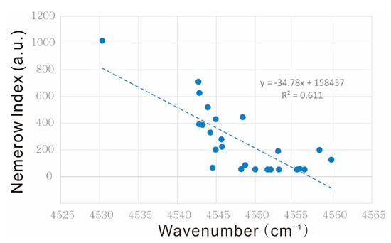 Across the entirety of the Nemerow index values, the combination bands of (ν + δ)OH shifted gradually from 4530.33 to 4559.88 cm−1. Figure 8 shows a linear correlation between the band position and the Nemerow index of the content of the six heavy metals for the 25 samples collected from the agricultural area in Tongguan County, and this relationship indicated that the absorptions observed near 4548 cm−1 shifted toward a higher frequency as the Nemerow Index of the six heavy metals decreased.