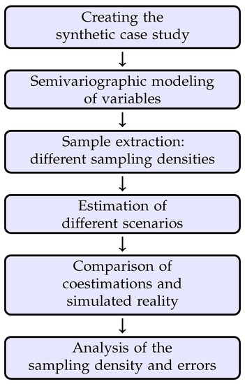 This section summarizes the most relevant stages of the study, which are implemented using the GSLIB algorithms, acronym for “Geostatistical Software Library”, developed in the Petroleum Engineering Department of Stanford University. It is considered one of the most relevant computer developments in the history of geostatistics by some researchers [30]. The whole process is computed in Python by the authors. The sequence of the main stages of this study is represented in Figure 1.