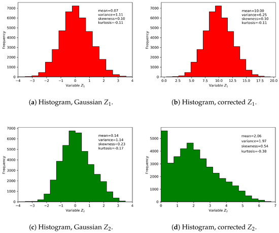 For , the 47% of the corrected data were negative and they were replaced by a positive small value. Thus, the histogram has a positive asymmetric form, see Figure 2. The simulations for both variables are shown in Figure 3.