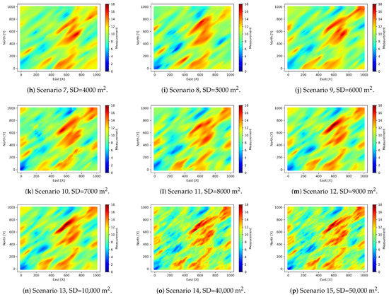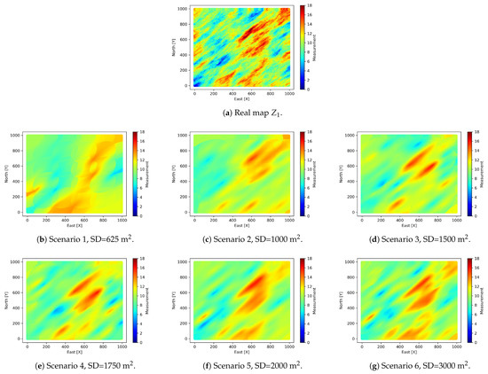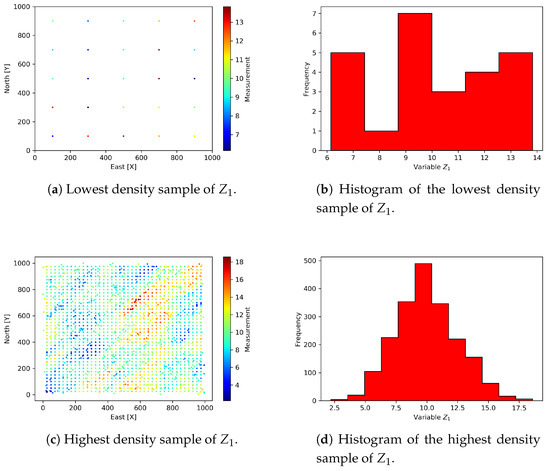 The third stage consists of extracting 15 different sampling densities (SD) from the exhaustive variable . These values will be combined with the values of to create the scenarios of estimation. Table 4 shows the sampling densities for . It can be observed that at higher sampling densities the error in statistical characterization is lower. The sampling density is constant for , i.e., all the spatial area of 1 km2 is considered for . A maximum sample size of 5% of the population has been considered, associated with high costs when retrieving information of metallic elements from the earth’s crust. It is typical to have case studies with smaller sample size than the 1% of the target population [17,32]. The limit scenarios (lowest and highest sampling densities) are presented in Figure 6.