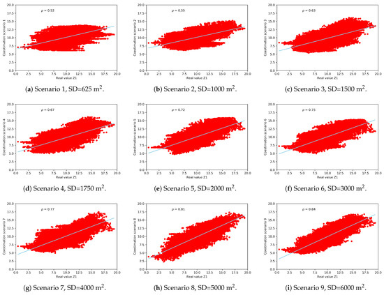 The estimation scenarios are compared with the simulated real map from which the samples of are extracted. It can be observed that smoothing is more noticeable in those scenarios with lower sampling density, see Figure 7. The coestimation is perfect when the linear correlation coefficient between the real scenario and the estimated scenario is 1. The linear correlation coefficient will depend on the number of observations and the semivariographic model that can be fitted according to these observations. Not very dense scenarios will poorly describe the spatial correlation, obtaining less accurate results. In Figure 8 the dispersion diagrams between the real variable and the 15 scenarios are represented, indicating the linear correlation coefficient. The linear correlation coefficient of scenario 11 (320 observations) is 0.88 and the map of the variable respects the real spatial structure. Scenarios with higher sampling density present also good features.