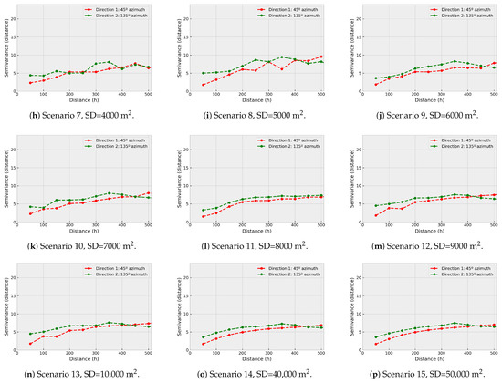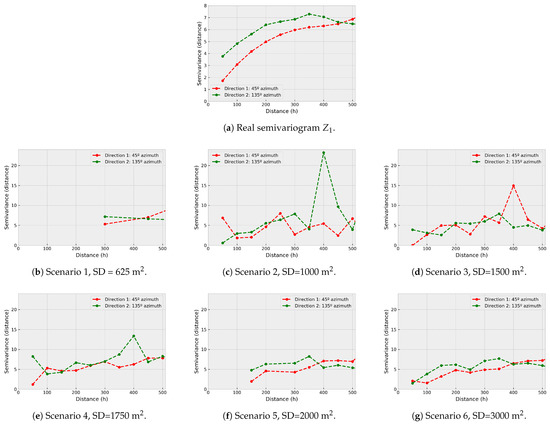 In Figure 9 the direct semivariograms of are shown. It can be observed that they are similar to the real one for densities equivalent to 0.8% or greater, which is associated with the fact that in these cases the mathematical adjustment should also be similar to the real with independence of the modelization technique. When the sampling density decreases, the direct semivariogram of becomes more erratic, decreasing its spatial correlation.