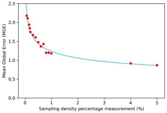 As expected at higher sampling densities, the mean squared error is smaller (MSE), see Figure 10. The relationship between the sampling density in percentage measure (SDP) and the mean global error (MGE) can be expressed using this potential function: