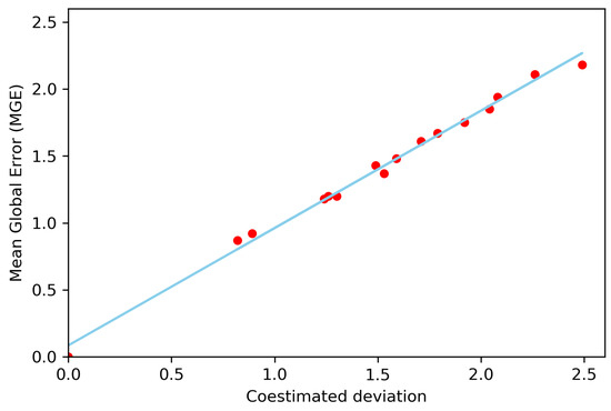 The deviation of the coestimation is directly proportional to the mean global error. The correlation coefficient is 0.99, which indicates that the application of the collocated ordinary cokriging method was consistent and reliable, see Figure 12. Applying linear regression to find the relationship between the mean global error and the coestimated deviation, the corrected coestimated deviation is obtained: