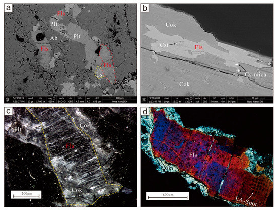 The Nanyangshan rare metal deposit is located in NQO, Western Henan Province, central China. The rare metal mineralization is hosted in granitic pegmatite [4]. According to the classification and revision by Černý [5] and Černý and Ercit [6], it is classified as LCT pegmatite. The Ar-Ar dating of muscovite revealed that the Nanyangshan pegmatite formed at 396–410 Ma [7], and the age coincides with the time of U-REE-rare metal mineralization (mean = 408 Ma) in NQO [8,9,10], shortly after 400–428 Ma (mean = 417 Ma), when the related intrusions formed, indicating that the mineral formed in the late stage of the evolution of a pegmatite-forming magmatic liquid. The new mineral is closely associated with luanshiweiite (first recorded locality [1]), polylithionite, cookeite, albite, quartz and an unknown Cs-rich mica (Figure 1a,b), and it is commonly found with spodumene, montebrasite, elbaite, fluorapatite, pollucite, and nanpingite. Tantalite-(Mn), columbite-(Mn), bismutotantalite, stibiotantalite, oxynatromicrolite (first recorded locality [11]), and fluornatromicrolite are some other associated minerals.