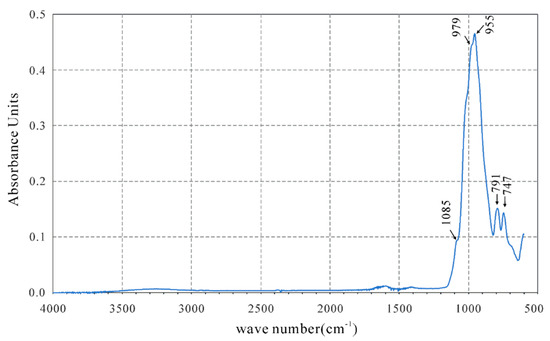 The vibrations of mica group minerals can be roughly separated into the vibrational region of hydroxyl groups and the lattice vibrational region, including the vibrations of Si(Al)O4 tetrahedra and octahedrally coordinated cations [13]. In the IR spectrum of fluorluanshiweiite (Figure 2), the bands at 747 and 791 cm−1 are due to the Al–O fundamental modes, and the bands at 955, 979, and 1085 cm−1 are due to the Si–O fundamental modes, resembling the spectrum of luanshiweiite (760, 798, 891, 988, and 1115 cm−1) [1] and similar to the infrared spectral reference cards (Sil59, Sil60) of the lepidolite series [14].