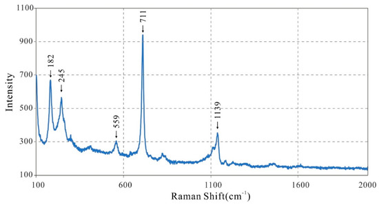 Raman spectra of mica minerals show several peaks in the low-wavenumber region: ~100, ~160, ~195, ~220, and ~240 cm−1, of which peaks at ~195 and ~240 cm−1 are generally strong in diocatahedral lepidolite [19]. On the basis of the previous results of Loh [20], the peaks at 182 and 245 cm−1 for fluorluanshiweiite may be assigned to the internal vibrations of the MO6 octahedron (Figure 3).