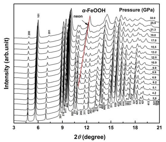 - Reagan, M.M.; Gleason, A.E.; Daemen, L.; Xiao, Y.; Mao, W.L. High-Pressure Behavior of the Polymorphs of Feooh. Am. Mineral. 2016, 101, 1483–1488. [Google Scholar] [CrossRef]
