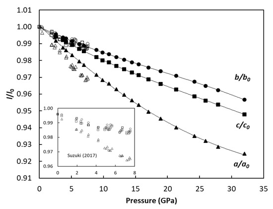 - Suzuki, A. Pressure–Volume–Temperature Equation of State of E–Feooh to 11 Gpa and 700 K. J. Mineral. Petrol. Sci. 2016, 111, 420–424. [Google Scholar] [CrossRef][Green Version]