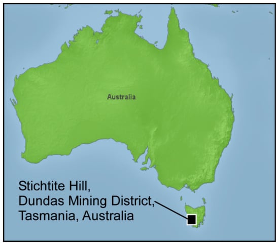 Sample location map, showing the location of Stichtite Hill and the Dundas Mining District, Tasmania, Australia (Black Square).