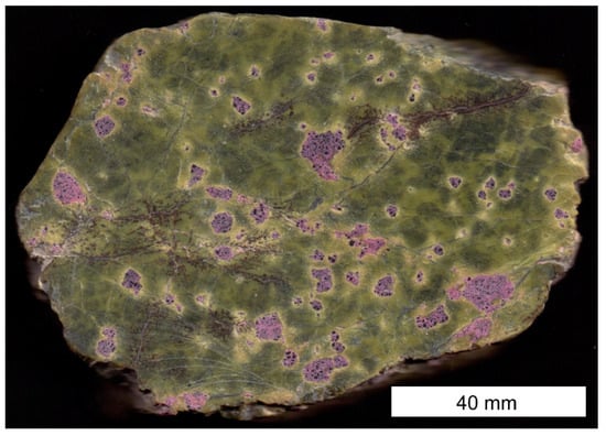 The stichtite occurrences of Tasmania, Australia are hosted by serpentinized mid-Cambrian ultramafic rocks known as the Dundas ultramafic complex [,]. This unit consists of heavily serpentinized ultramafic rocks, gabbros, and basaltic volcanic rocks. Three types of serpentinite are recognized in these rocks []. There are black serpentinites—these are unsheared, often contain abundant fine-grained magnetite, and are dominantly lizardite, which has replaced olivine-bearing ultramafic rocks. There are also green serpentinites, which are lizardite-chrysotile mixtures with localized deformation patterns and brecciation. Finally, there are sheared-contact serpentinites that consist mainly of chrysotile and rare antigorite, and may have formed during tectonic emplacement of the Adamsfield Ultramafic Complex []. All three of these serpentinite bodies lie within Middle to Late Cambrian strata. Stichtite mineralization occurs mainly within massive chromite-rich green serpentinite, and rarely within its border zones with black serpentinite []. Stichtite has a strong association with zones of brecciated green serpentinite [].