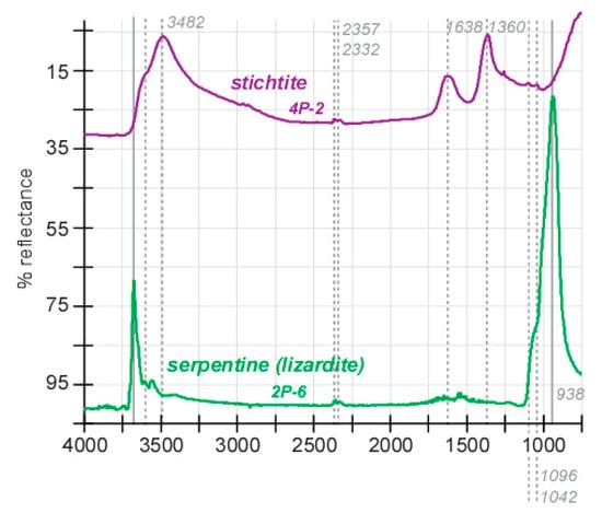 The results of FTIR analyses of unoriented stichtite and serpentine (i.e., lizardite +/− chrysotile) are presented in Figure 3, Figure 4, Figure 5 and Figure 6. Stichtite shows prominent and generally broad spectral features at 1042, 1096, 1360, 1638, and 3482 cm−1. The serpentine matrix shows prominent and generally narrow, intense spectral features at 938 and 3680 cm−1 (Figure 3). The group of peaks from 3680 cm−1 to 3482 cm−1 correspond to the position of peaks that arise from OH− stretching modes, where OH− groups are bound to Mg (serpentine and stitchtite) or Cr (stitchtite). An intense peak due to CO32− antisymmetric stretches appears in stichtite at 1360 cm−1, which is absent in serpentine. This is ~20 cm−1 lower than the previous measurements of synthetic stichtite (e.g., this peak is reported to appear at 1381 cm−1 by []), suggesting either (1) a compositional dependence on the cation identity bound to the carbonate anionic group and/or (2) an analytical dependence on the composition of the ATR crystal (diamond ATR in [] versus a silicon ATR in this study). There are smaller doublets that appear. It is possible that these arise because of insufficient “background” subtraction, i.e., there is CO2 from atmosphere gases in the path of the IR beam that are not fully accounted for during the analysis. The doublet peaks at 1096 and 1042 cm−1 may be interpreted either as CO32− bound in the stichtite, or potentially is interference from nearby serpentine that is inadvertently included in the analytical volume. Because the analytical volume is relatively small relative to the size of some stichtite pods, we prefer the former interpretation. The stichtite spectra also shows a dominant peak at 1638 cm−1, which is a deformation mode of molecular water, and is not present in the measurements of the serpentine matrix. The serpentine matrix has a sharp, intense peak at 938 cm−1 with an apparent, lower intensity shoulder at higher wave numbers. This peak is absent in stitchtite analyses and is attributed to Si–O bond motions in the silica tetrahedron in lizardite +/− chrysotile.