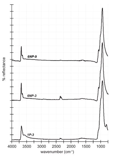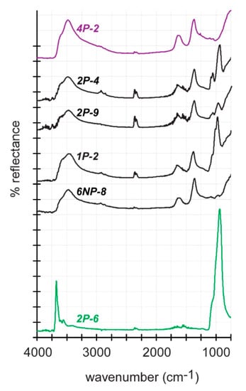 Measurements of regions in samples at the boundary between stichtite pods and serpentine matrix, contain all of the characteristic spectral features of stichtite, but also contain a peak at 938 cm−1, which is attributed to Si–O bond stretches (e.g., 2P-4, 2P-9, 1P-2, 6NP-8; Figure 6). The intensity of the peak at 938 cm−1 varies, and the narrow peak at 3680 cm−1 observed in the serpentine matrix is not present in these mixed measurements (Figure 6). This suggests that these analyses contain a silicate mineral in the analysis volume, but that it lacks the highly ordered Mg–OH stretches observed in the lizardite +/− chrysotile serpentine matrix (Figure 3 and Figure 4). One possibility is that these analyses contain traces of clinochore in addition to stichtite. Clinochore is known to be present in stichtite pods from the more altered samples from the same mine (Figure 3b in Reference []), present as veinlets that pervade and surround the stichtite matrix. Although the samples in this study were selected for freshness, the FTIR spectra suggest that perhaps incipient clinochore veins exist at the boundary between the serpentine matrix and stichtite pods (e.g., 2P-4, 2P-9, 1P-2, 6NP-8) and also within some stichtite pods (6NP-6, 2P-5, and 2P-2).