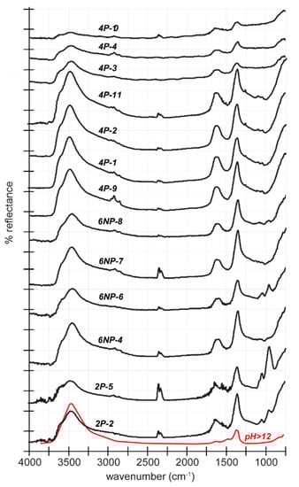 FTIR spectra for stichtite nodules in samples 2P, 6NP, 4P. Red spectra is a synthetic stichtite precipitated from fluids with pH > 12 [].