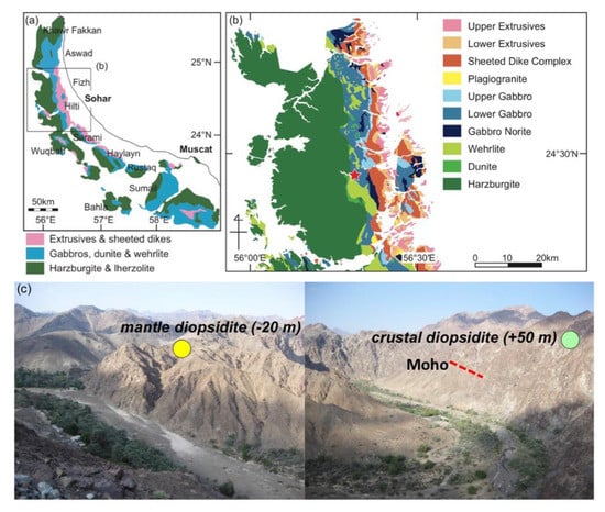 - Akizawa, N.; Arai, S.; Tamura, A.; Uesugi, J.; Python, M. Crustal diopsidites from the northern Oman ophiolite: Evidence for hydrothermal circulation through suboceanic Moho. J. Mineral. Petrol. Sci. 2011, 106, 261–266. [Google Scholar] [CrossRef][Green Version]