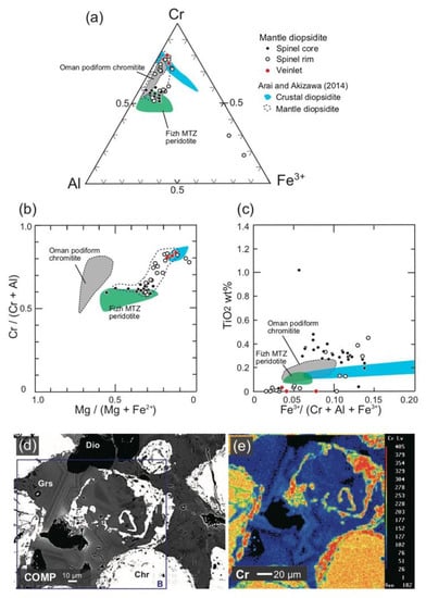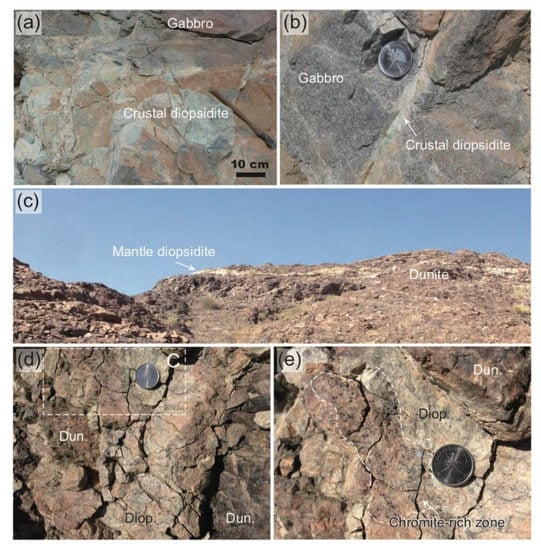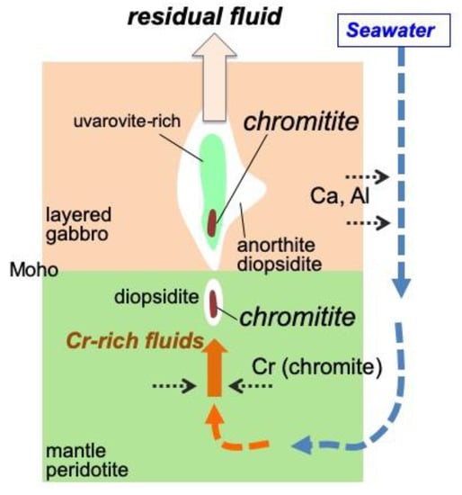 - Akizawa, N.; Arai, S. Petrology of mantle diopsidite from Wadi Fizh, northern Oman ophiolite: Cr and REE mobility by hydrothermal solution. Island Arc 2014, 23, 269–280. [Google Scholar] [CrossRef]