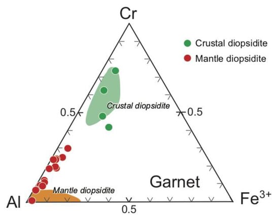 - Tsujimori, T.; Liou, J.G. Coexisting chromian omphacite and diopside in tremolite schist from the Chugoku Mountains, SW Japan: The effect of Cr on the omphacite-diopside immiscibility gap. Am. Mineral. 2004, 89, 7–14. [Google Scholar] [CrossRef]