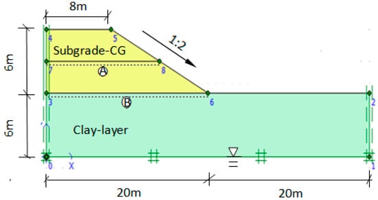 The numerical modeling of the full-scale embankment was performed using a finite element software. The model is based on the construction of a subgrade with a top width of 16m on a soft soil foundation [39]. In order to ensure the stability of the coal gangue subgrade, when the filling height is 8 m, the slope rate should not be steeper than 1:1.5 [24]. Thus, the subgrade model selects the height of 6m and the slope rate of 1:2, and a layer of clay with a depth of 6 m distributed underneath. In this paper, due to the symmetry of the geometric model, the right half is intercepted for analysis. Since it is assumed that the deep compact sand layer will not deform according to the code [40], when the bottom of the clay layer is a dense sand layer, the settlement deformation can be calculated to the top surface of the sand layer. Therefore, a fixed boundary is used instead of the sand layer below the clay layer. At the time of the construction of the subgrade, there are three interfaces, namely, the first and second layers of coal gangue subgrade boundary (A Interface), the coal gangue subgrade and the lower clay boundary (B Interface) and the clay layer and the dense sand layer boundary. The three interface virtual thickness factors are 0.1. Since the strength of the interface is lower than that of the adjacent soil layer, the strength of the interface material should be reduced on the surrounding soil layer. According to the PLAXIS manual, it can be assumed that the strength reduction factor Rinter is 2/3, so 0.67 is selected as Rinter in this paper. The definition of boundary conditions is accomplished by a standard fixed boundary in PLAXIS software. The layered construction scheme is adopted in the construction, the single-layer thickness is 25–35 cm, the compaction degree is 90%. The model selects 15 node units. Medium encryption was selected for mesh generation, where the total number of units, nodes, and stresses were 277, 2457, and 3324, respectively. The average unit size was 1.32 m. The initial stress of the soil layer under the subgrade is calculated and the initial stress field is generated before the simulation calculation of the subgrade. The numerical example is an embankment model which is shown in Figure 1.