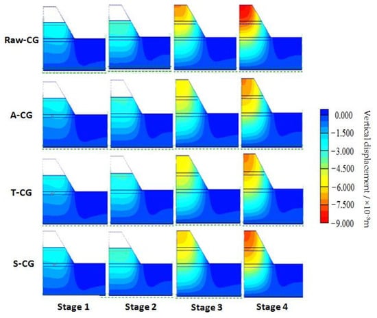 During the construction stage undrained analysis was used to simulate the layer-by-layer construction. The backfill which was divided into 10 layers, as in the field, was paved on the clay layer by layer. It is necessary to compact the previous layer before the next layer was added. After the completion of the full height of the embankment, the drained analysis was used to imitate the consolidation process. The embankment model construction procedure consists of four stages, the first layer filling with a height of 3 m coal gangue and completing in five days (Stage 1), the subsequent consolidation period of 200 days (Stage 2), followed by filling the remaining 3 m coal gangue for five days (Stage 3) and afterward, a long-term consolidation (Stage 4, the criterion is that the minimum pore water pressure is less than 1 kN/m2), is based on the actual embankment construction process. The vertical displacement cloud model of each construction process of Raw-CG, A-CG, T-CG and S-CG subgrade are shown in Figure 2.