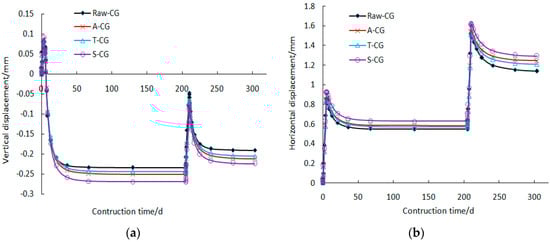 It can be seen from Figure 2 that the larger vertical displacement is concentrated in the area between the foundation surface and 4.0 m below the base surface and decreases as the depth increases. Consolidation promotes vertical displacement. Particularly, the vertical displacement of the embankment has been greatly increased after long-term consolidation. The order of the area and depth of the final settlement is Raw-CG > S-CG > T-CG > A-CG. The maximum vertical displacement values in the stages are listed in Table 3.